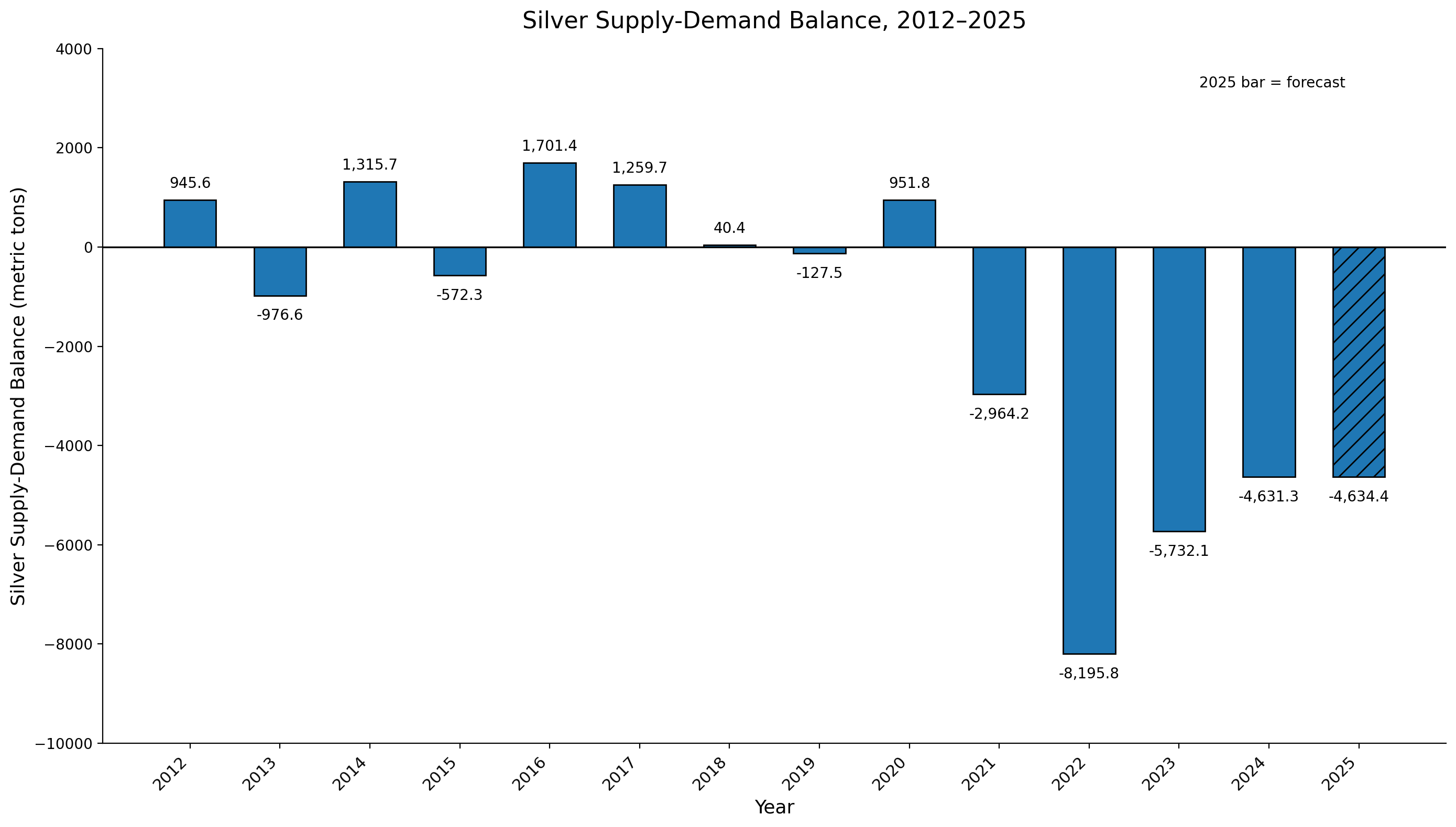 Figure 1. Silver supply-demand balance, 2012–2025. Data source: The Silver Institute.