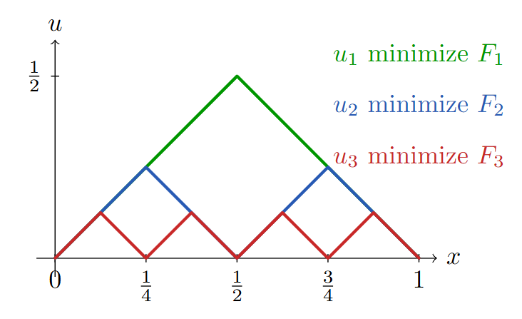 which shows that the pointwise limit $u$ is not the minimizer of $F$. Hence, we need to find a new type of convergence to answer the above question, which motivates the definition of $\Gamma-$convergence.